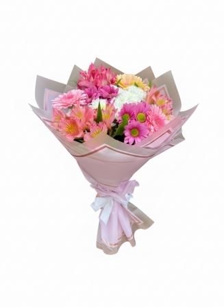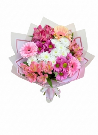 Един ярък букет от гербери, хризантеми и алстромерия! Опакован стилно с луксозна хартия и панделка.                                Букета съдържа: 5 хризантеми, 3 гербера и 3 алстомерии, панделка и опаковка.Цвета на цветята е според наличноста .