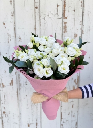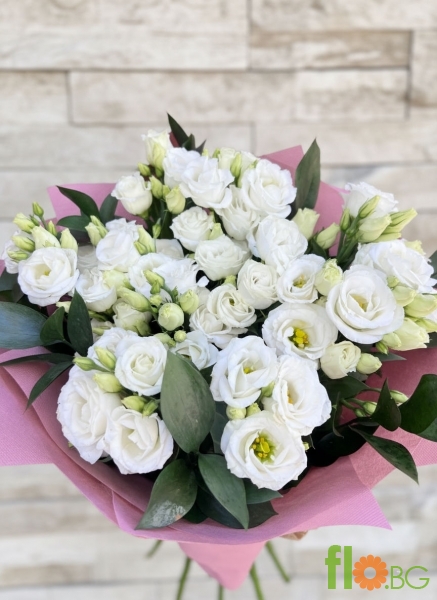 Изтънчен букет от девет бели еустоми, подредени с внимание и обвити в елегантна розова хартия с натурална панделка. Белите еустоми символизират чистота, нежност и искреност – идеален избор за сватба, годишнина, рожден ден или просто за да изразите своите чувства. Този букет впечатлява с изящество и лекота, съчетавайки класика и съвременен стил. Подходящ е както за подарък на любима жена, така и за елегантен жест на внимание.