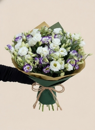 Нежен и стилен букет от 15 еустоми в бяло и лилаво — символ на чистота, благодарност и изисканост. Аранжировката е оформена в тъмнозелена и златна хартия, завързана с естествен конопен канап, което придава естествен и модерен вид. Подходящ за рожден ден, годишнина, кръщене или за да изразите внимание и обич. Перфектен избор за хора с фин вкус и любов към елегантните детайли.