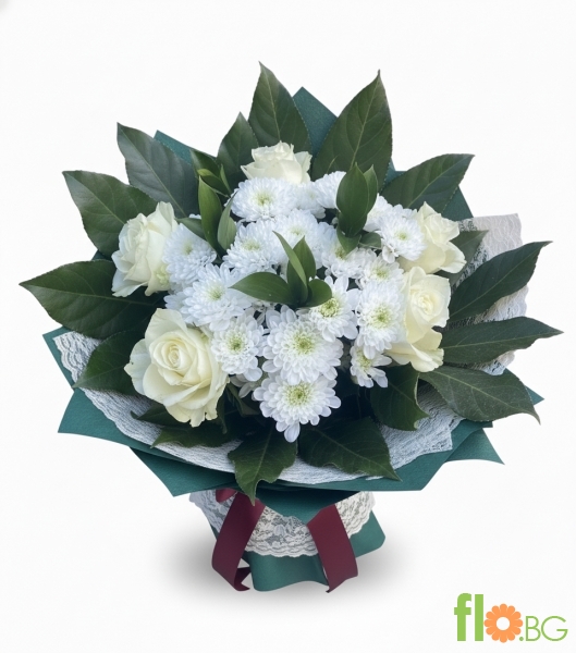 Букет от пет прекрасни бели рози, обгърнати от бели хризантеми, стилно опаковани в луксозна хартия.Един чудесен начин да зарадвате вашите близки.