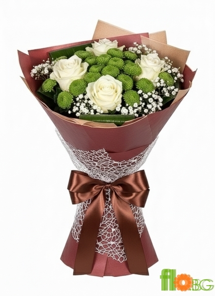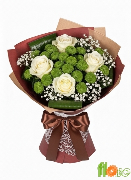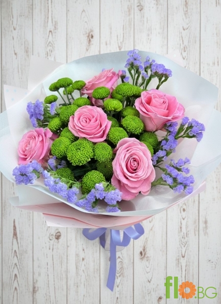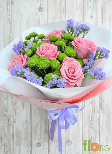 Bouquet of Pink Roses and Green Chrysanthemums – Spring Harmony