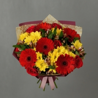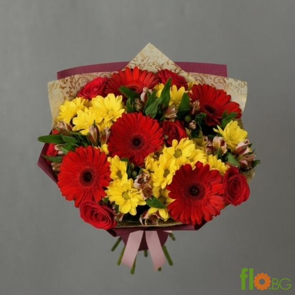 Подарете радост на човека, когото обичате с това цветно изкушение. Букета съдържа 5 рози , 4 гербера,3 хризантеми и 3 алстромерии,луксозна хартия и панделка.