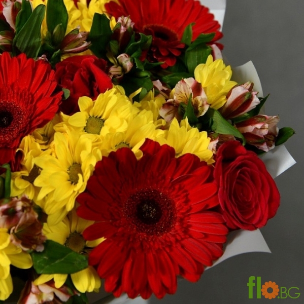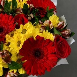 Подарите радость любимому человеку этим красочным искушением. В букете 5 роз, 4 герберы, 3 хризантемы и 3 альстромерии, роскошная бумага и лента.