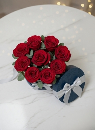 Зарадвайте любимият човек с 9 червени рози, аранжирани със зеленина в луксозна кутия, която дълго време ще напомня за Вас!Цвета на кутията е според наличността!