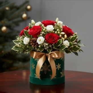 Луксозна празнична аранжировка в кутия, съдържаща 7 червени рози, 3 еустоми, 3 алстромерии и свежа зеленина. Подредена с внимание и украсена с шишарки, декоративни елементи и златна панделка, тази кутия излъчва топлина, уют и празничен дух. Перфектен избор за подарък по време на Коледа, Нова година или зимен повод. Елегантна комбинация от класика и изисканост, която ще внесе настроение във всеки дом.