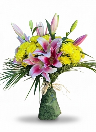 Прекрасен лилиум-2бр в съчетание със 5 холандски жълти хризантеми,обвити с листа от рубелине