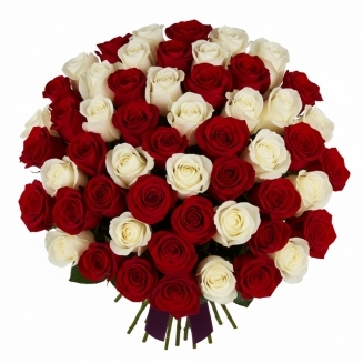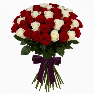 Elegant bouquet of 51 red and white roses tied with a dark purple ribbon – a symbol of love, passion, and purity. Perfect for a romantic or special occasion.