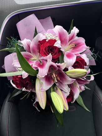 Едно класическо съчетание от ориенталски лилиум и прекрасни червени рози,аранжирани богато с гипсофила и беарграс.