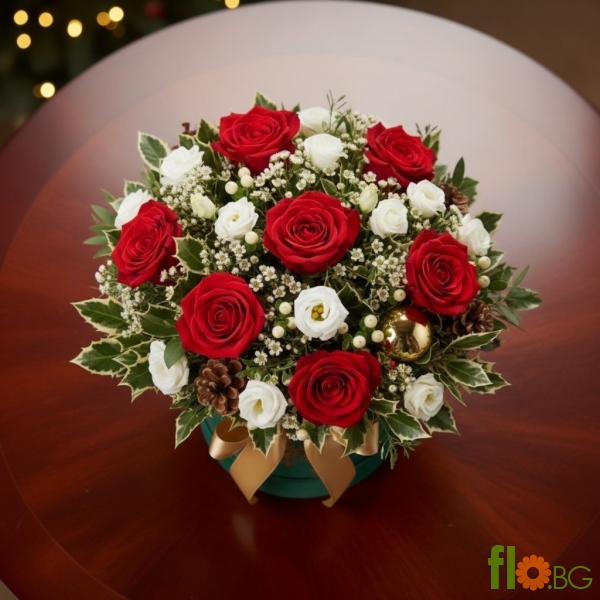 Луксозна празнична аранжировка в кутия, съдържаща 7 червени рози, 3 еустоми, 3 алстромерии и свежа зеленина. Подредена с внимание и украсена с шишарки, декоративни елементи и златна панделка, тази кутия излъчва топлина, уют и празничен дух. Перфектен избор за подарък по време на Коледа, Нова година или зимен повод. Елегантна комбинация от класика и изисканост, която ще внесе настроение във всеки дом.